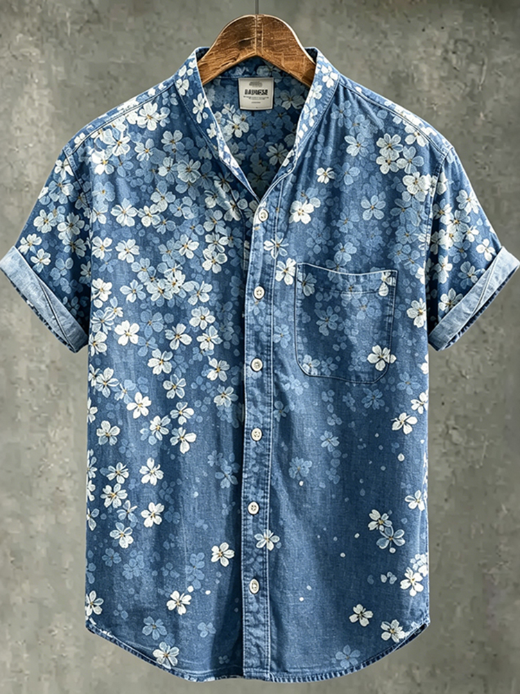 Men's Vintage Floral Art Linen Blend Short Sleeve Shirt
