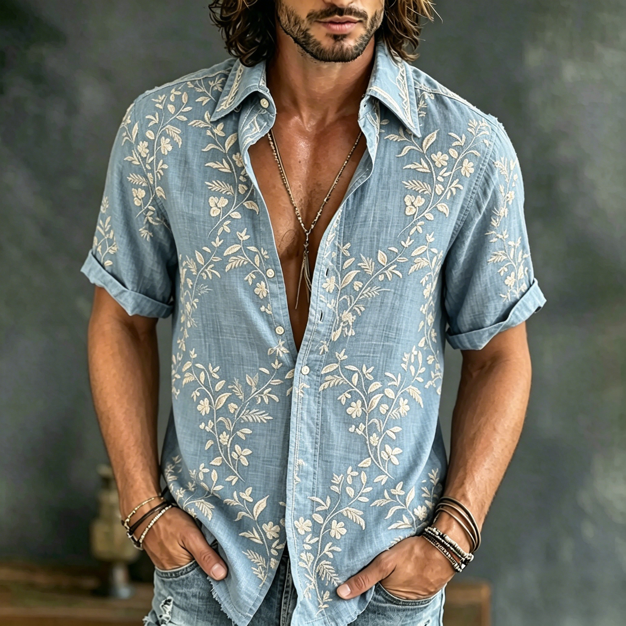 Men's Summer Floral Embroidered Art Print Flowy Linen Blend Shirt
