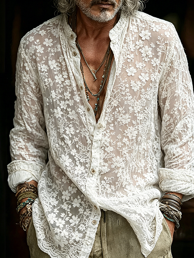 Vintage White Floral And Lace Art Embroidered Cotton Linen Long Sleeve Shirt