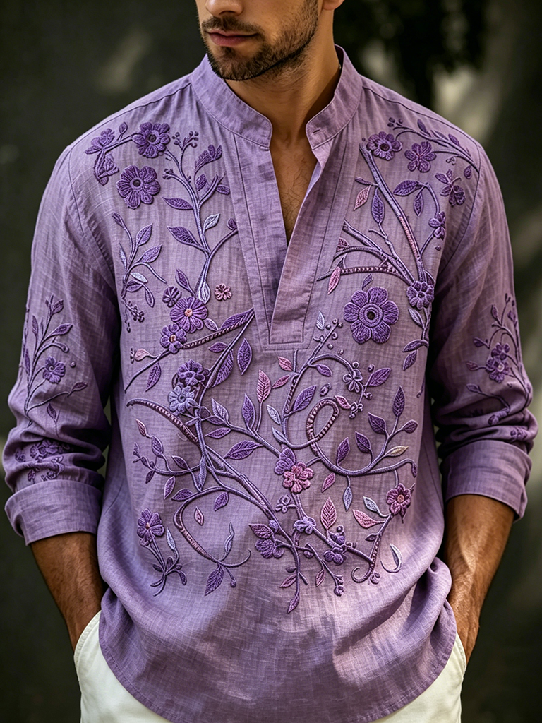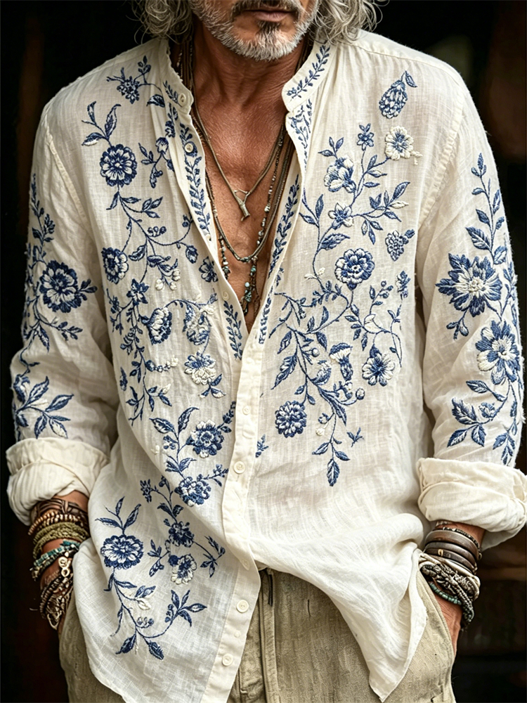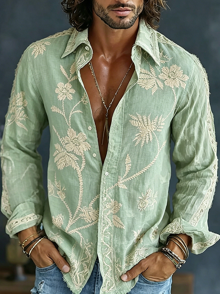 Men's Vintage Floral Embroidered Art Print Flowy Linen Blend Casual Shirt