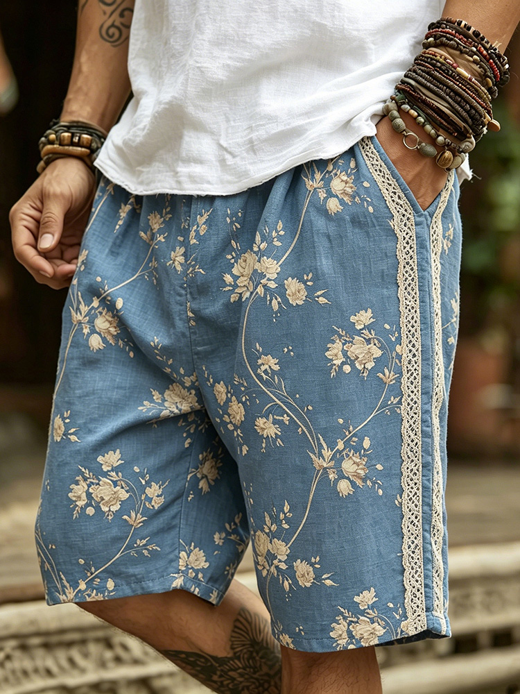 Men's Retro Bohemian Floral Print Casual Linen Shorts