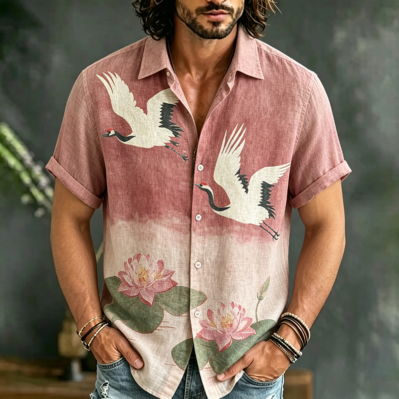 Men's Retro Lotus And Flying Crane Pattern Cotton Linen Casual Short-sleeve Shirt