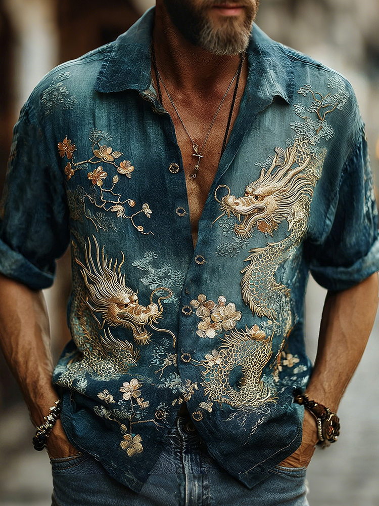 Men's Japanese Dragon & Apricot Blossom Art Linen Shirt
