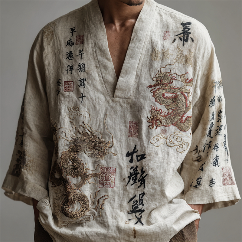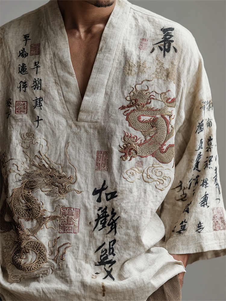 Men's Japanese Dragons Calligraphy Art Linen Shirt