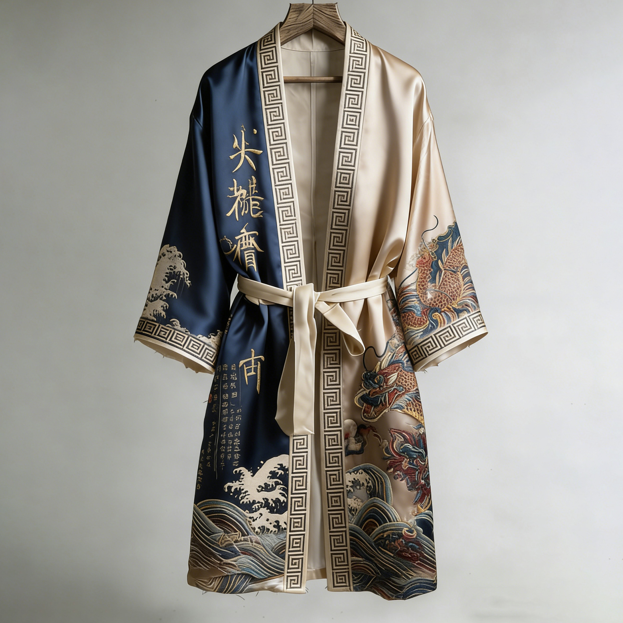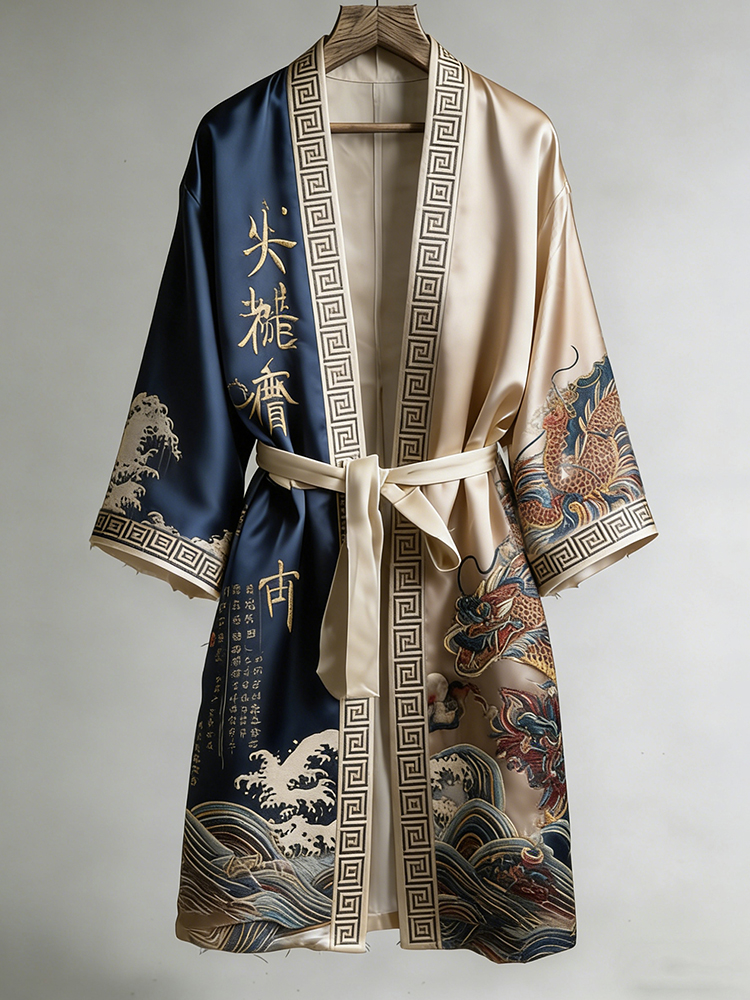 Japanese-style Dragon Pattern And Calligraphy Art Color-block Distressed Linen Kimono