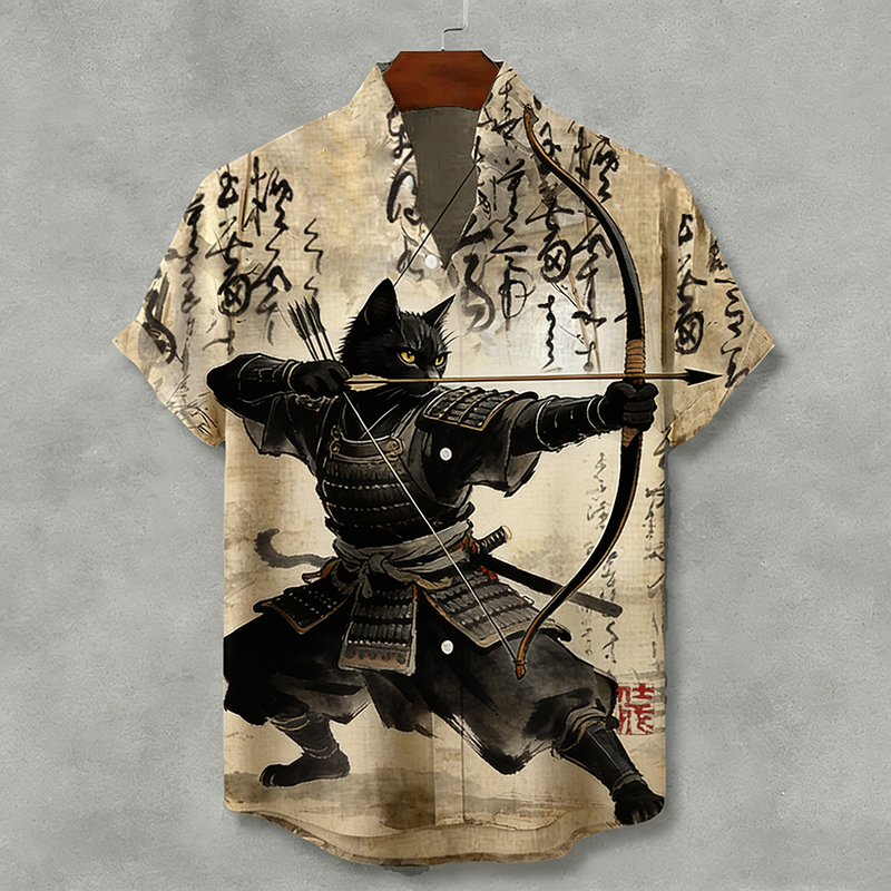 Japanese Black Cat Samurai Archery With Calligraphy Art Short Sleeve Shirt