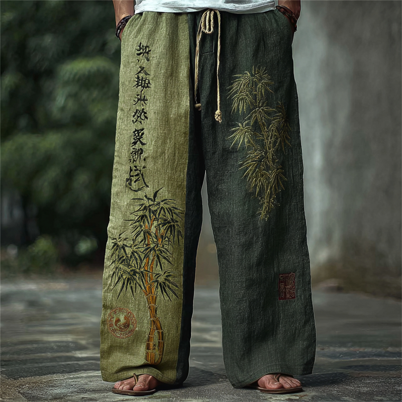 Men's Japanese Bamboo Calligraphy Art Contrast Linen Pants