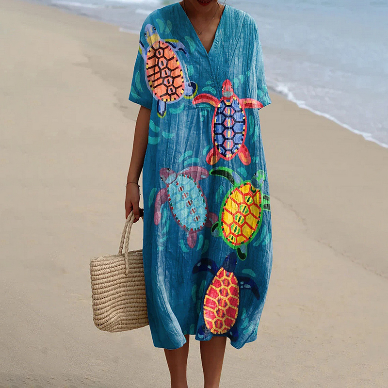 Women's Resort Collection Watercolor Turtle Pattern Casual Flowy Midi Dress