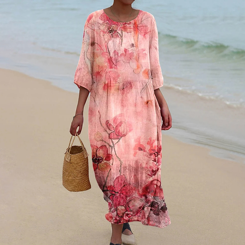 Women's Vintage Floral Print Crew Neck Linen Blend Midi Dress
