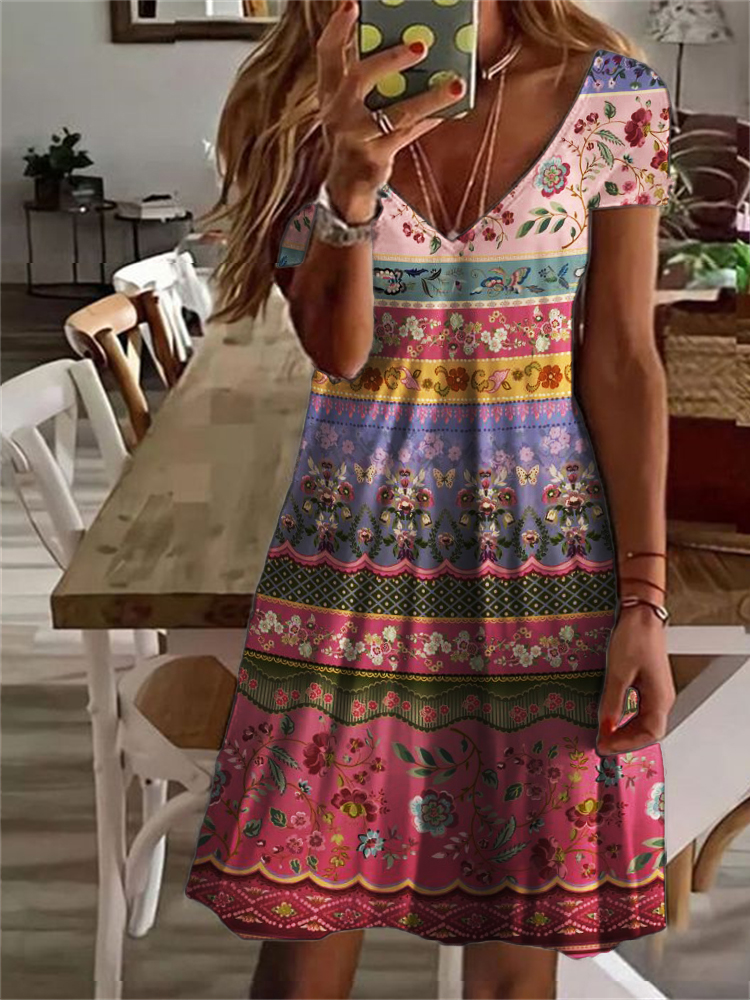 Boho Floral Printed Color Block V Neck Mini Dress