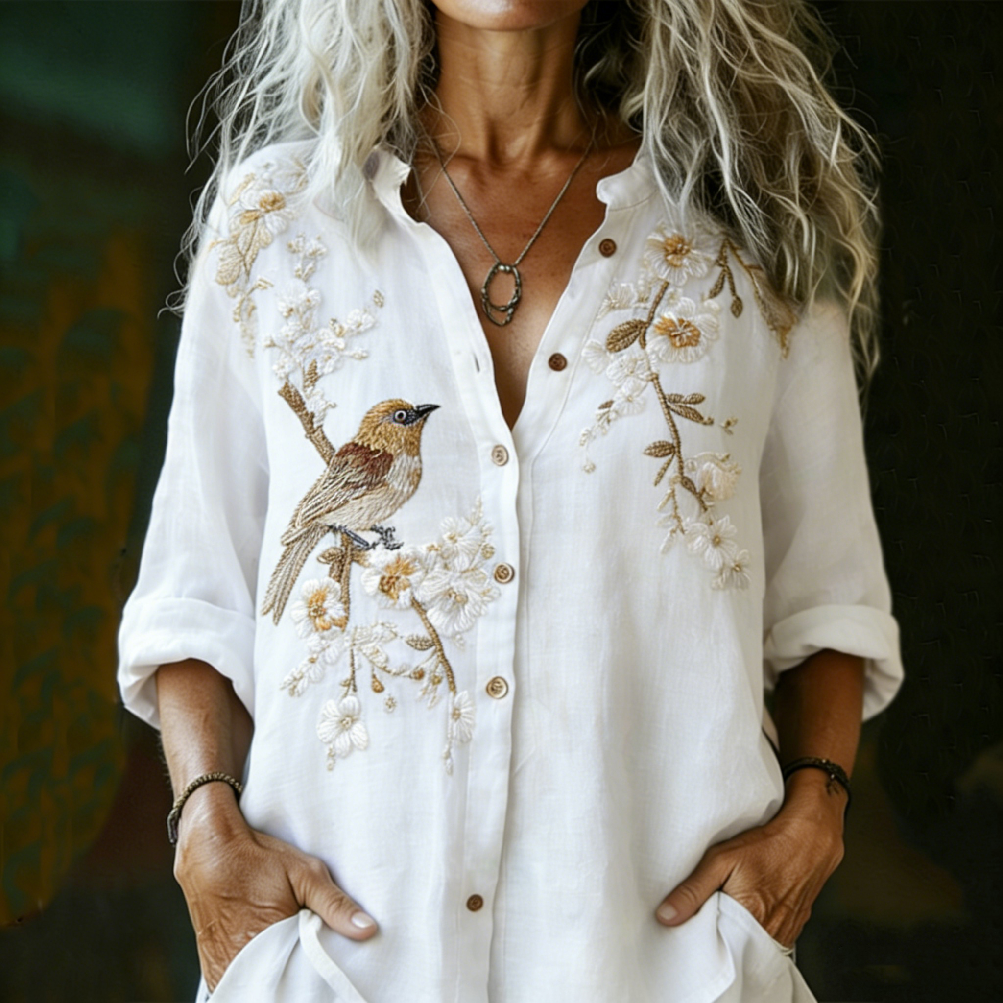 Women's Vintage Floral And Bird Print Long-sleeve Shirt