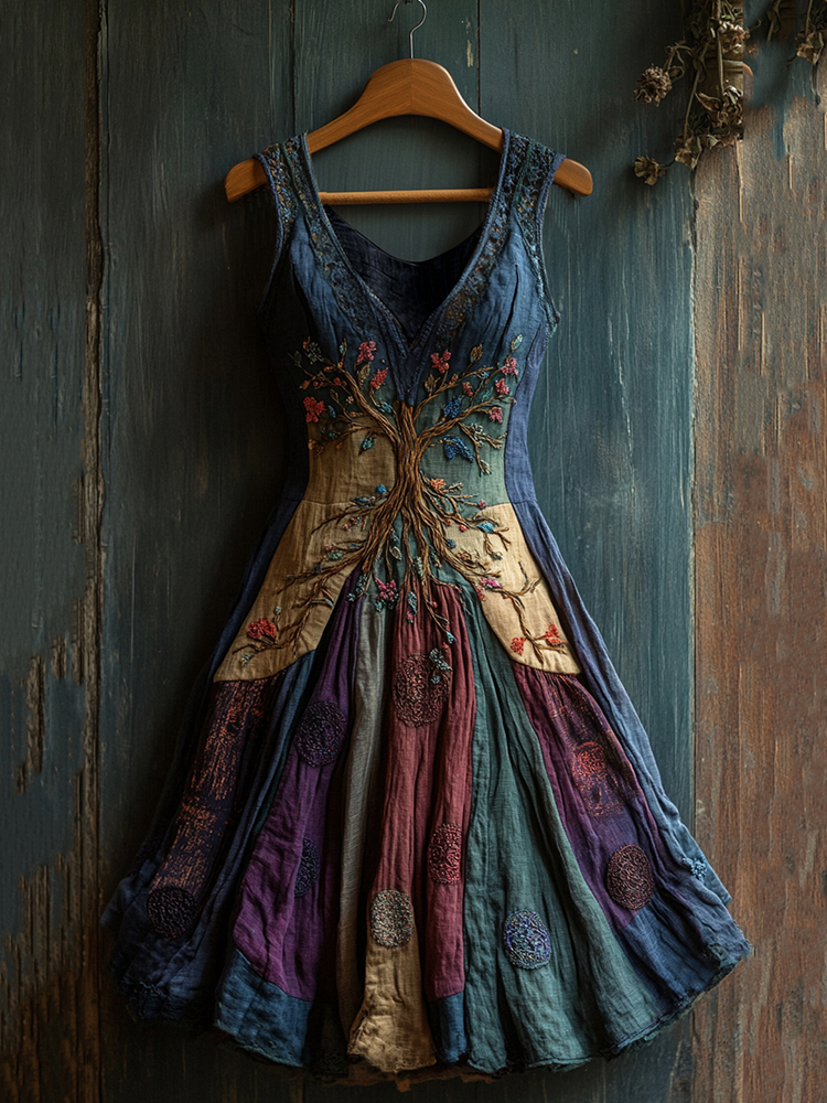 Vintage Viking Tree Of Life Embroidered Patchwork Linen Dress