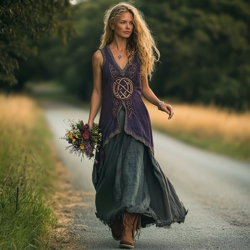 Women's Vintage Viking Celtic Knot Gradient Art Linen Vest Dress