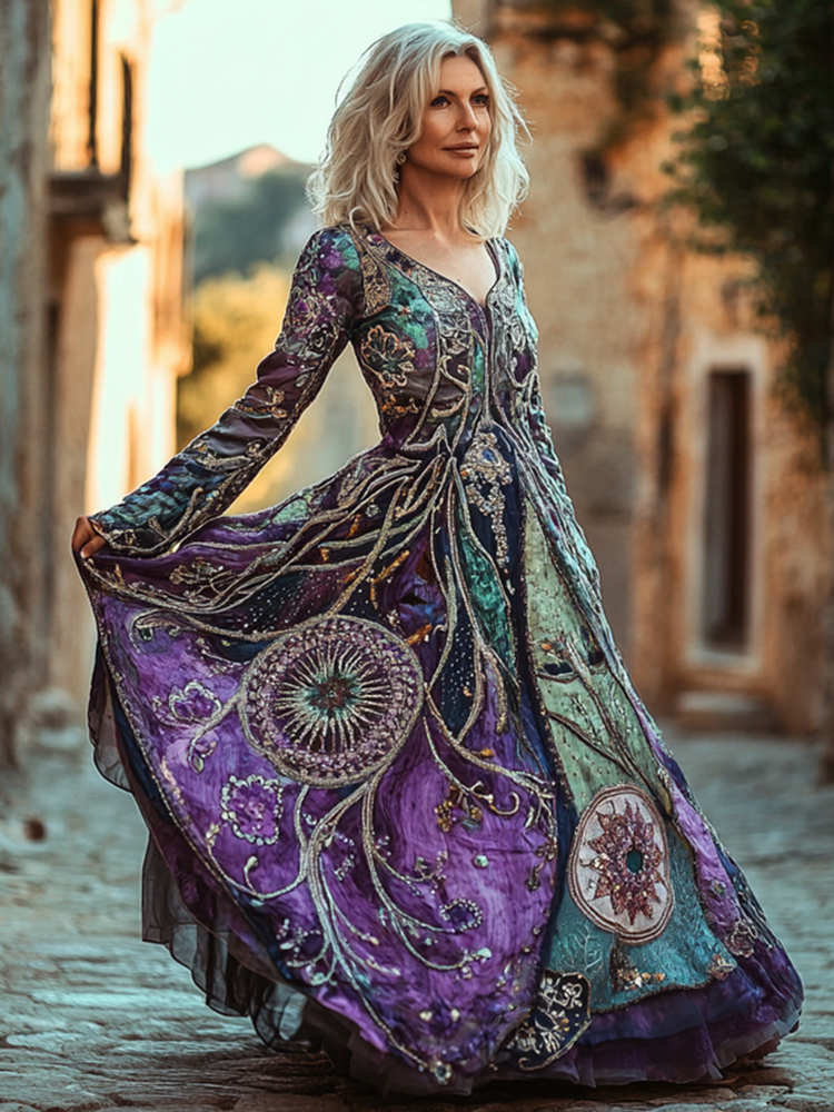 Vintage Viking Tribal Celtic Knot Art Linen V-neck Maxi Dress