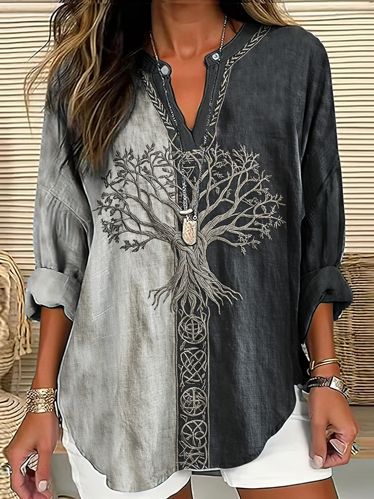 Women's Viking Life Of Tree Art Linen Print Casual Shirt