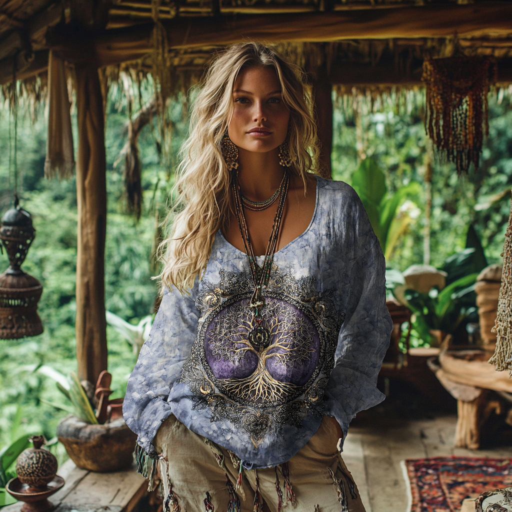 Women's Viking Style Tree Of Life Art Linen Casual T-shirt