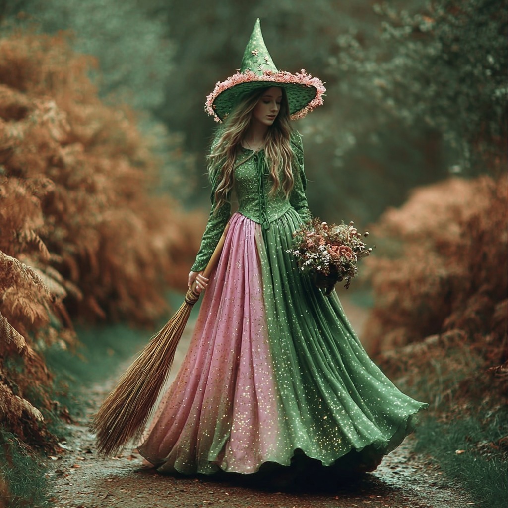 Halloween 2025 Color Clash Design Women's Long Sleeve Long Witch Dress