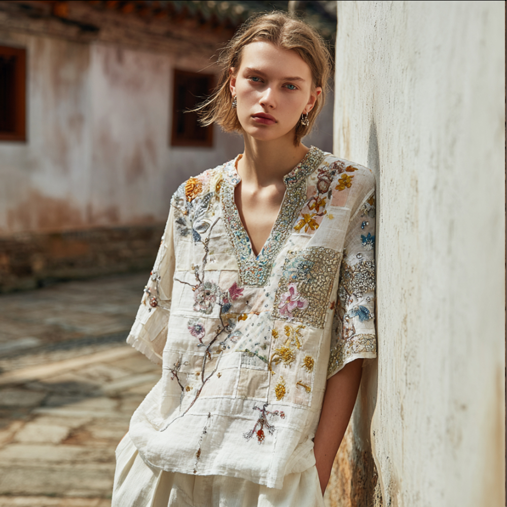 Bohemian-style Japanese Art Style Plant And Flower Embroidery V-neck Short-sleeved Shirt