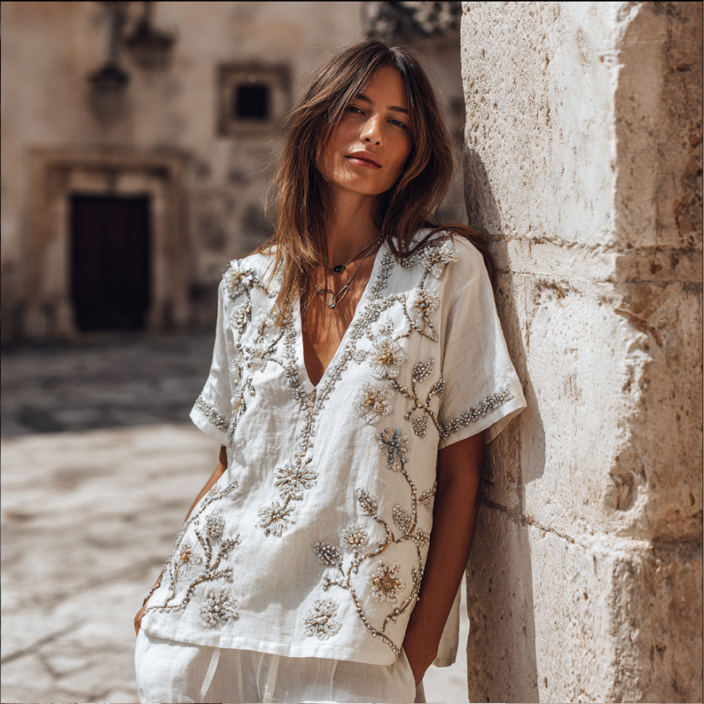 Bohemian Style Three-dimensional Floral Bead Embroidery V-neck Short-sleeved Shirt