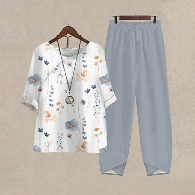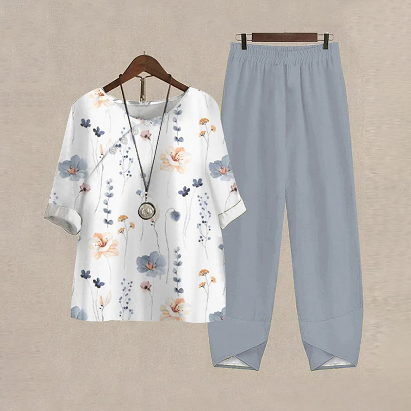 Botanical Floral Print Loose Fitting Top Pants Two Piece Set