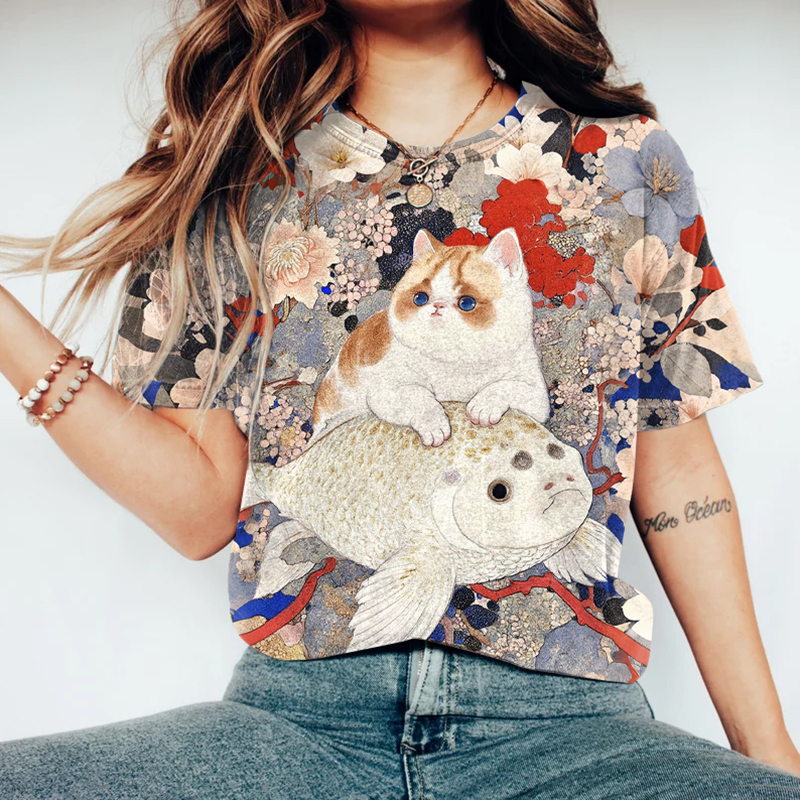Cat In Kimono Riding A Carp T-shirt