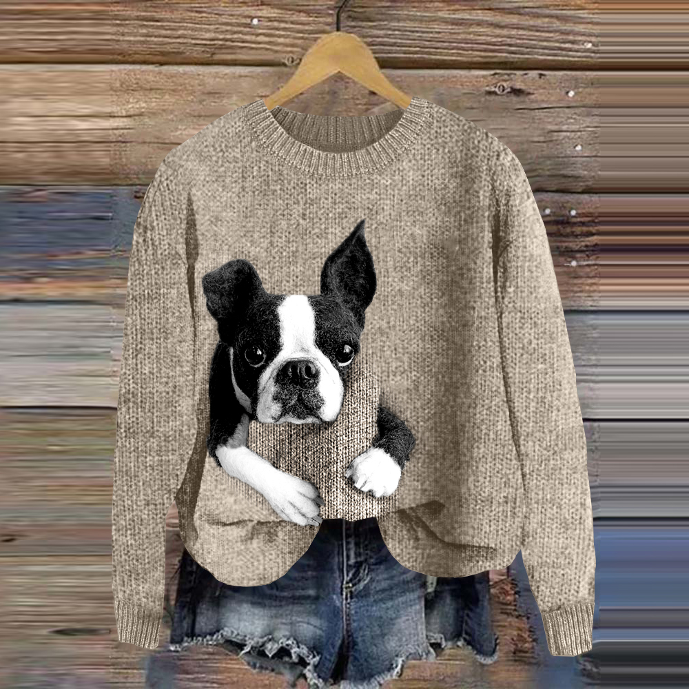 Cute Boston Terrier Lazy Puppy Applique Wool Felt Art Cozy Sweater