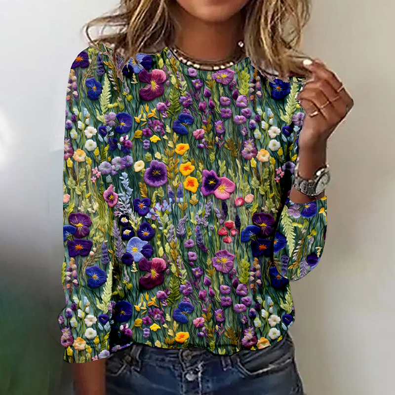 Elegant Violet Wildflower Embroidery Art Comfy T Shirt