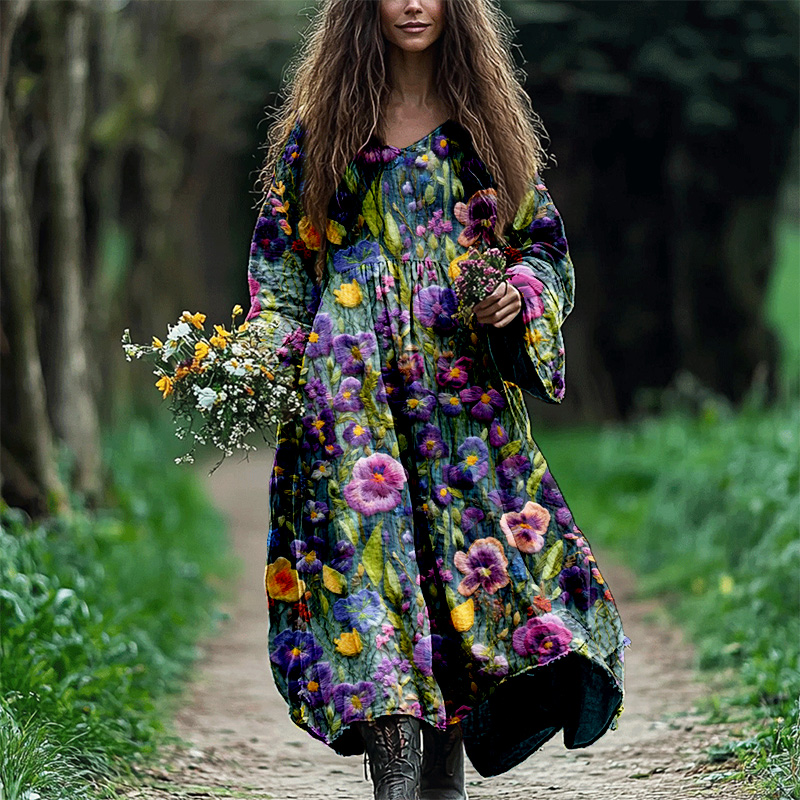 Elegant Violet Wildflower Embroidery Art Linen Blend Maxi Dress