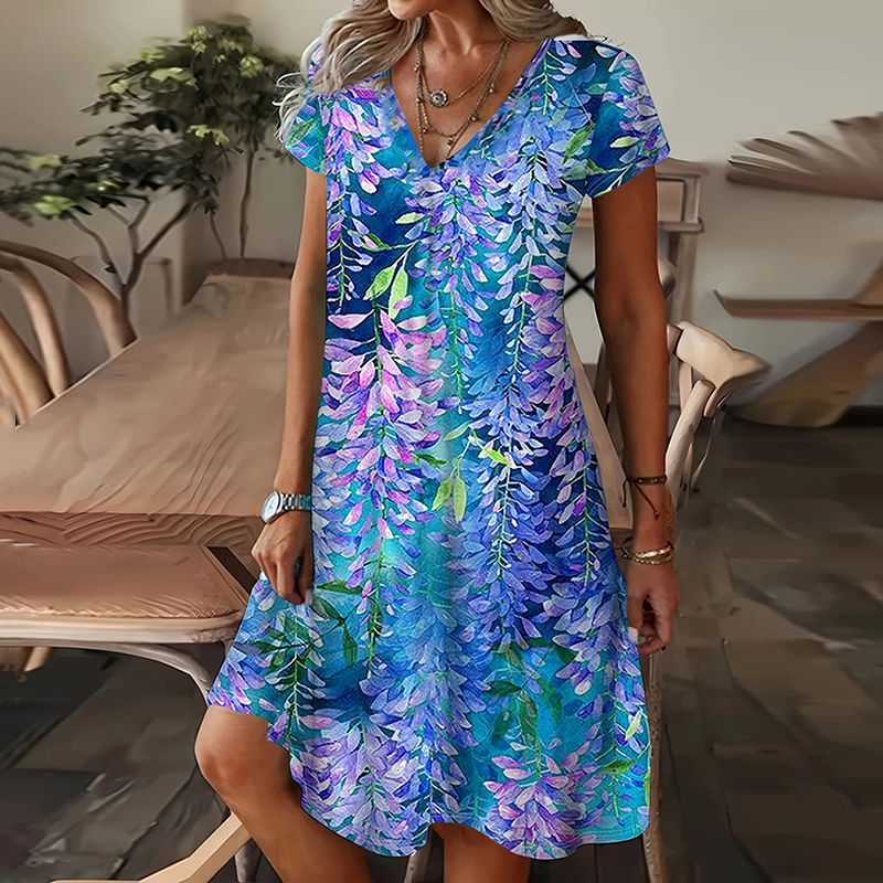 Floral Print V-neck Short Sleeved Midi Dress
