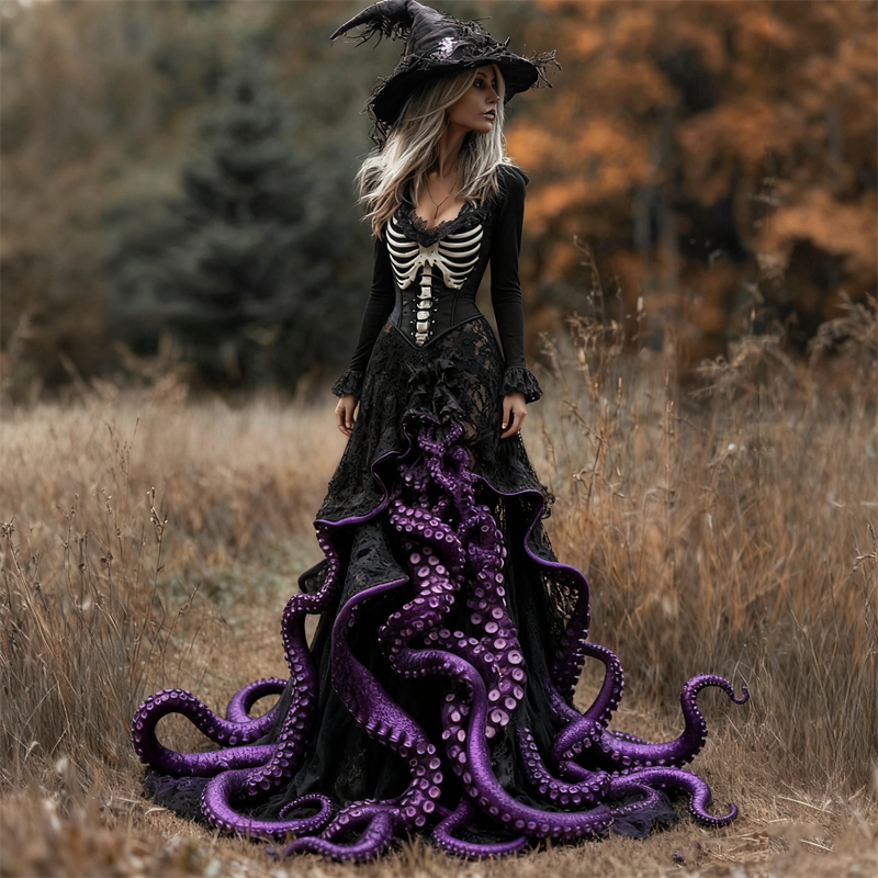 Halloween Evil Tentacles Skeleton Rib Cage Linen Maxi Dress