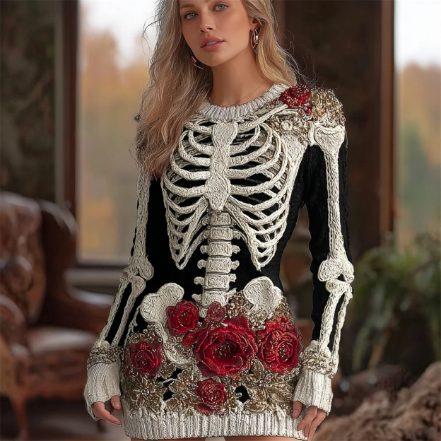 Halloween Skeleton & Rose Art Women's Crew Neck Knit Mini Dress