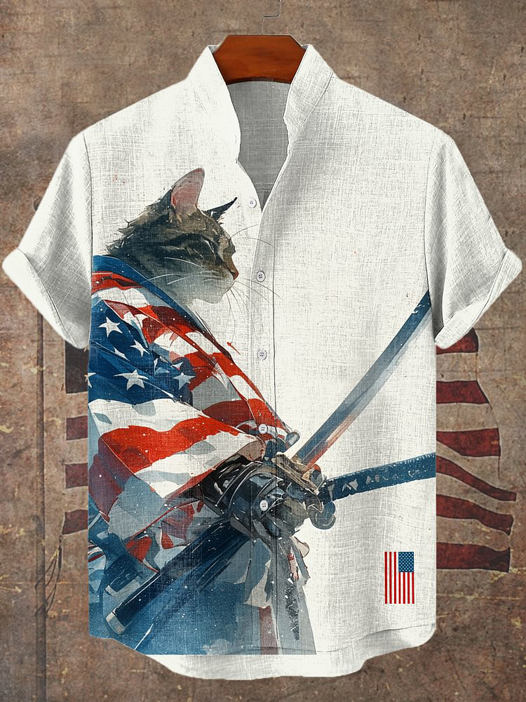 Japanese Art American Flag Robe Cat Ink Painting Short Sleeve Linen Blend Shirt