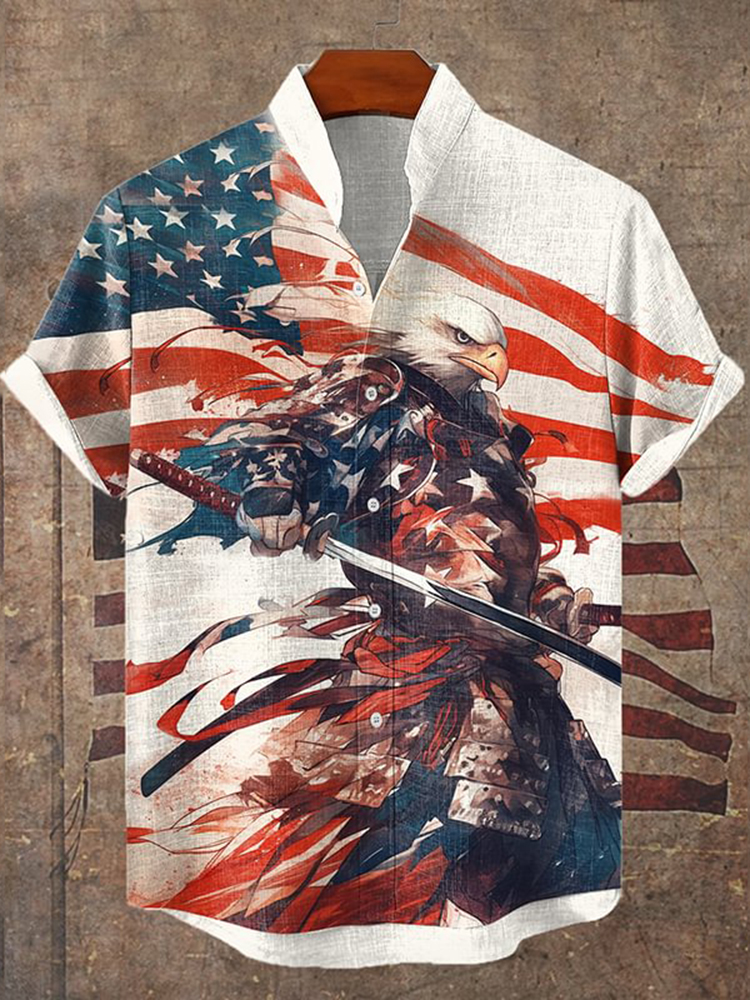 Japanese Art Eagle General Warrior American Flag Ink Painting Short Sleeve Linen Blend Shirt