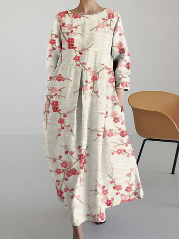 Japanese Plum Blossom Art Long Sleeved Loose Midi Dress