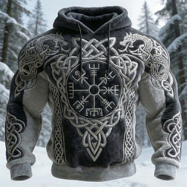 Men's Retro Celtic Compass Pattern Plush Hoodie