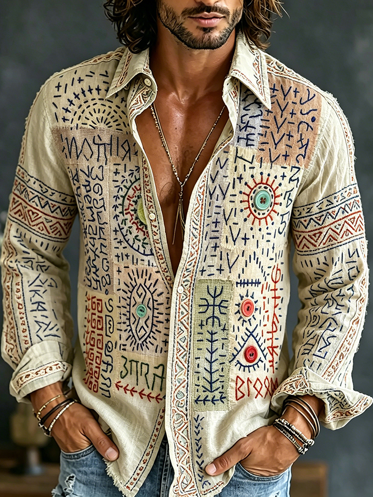 Men's Retro Texture Embroidered Art Print Flowy Linen Blend Shirt