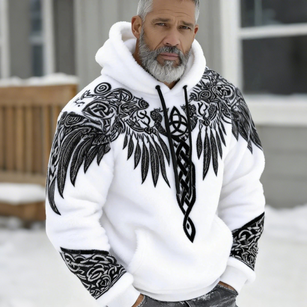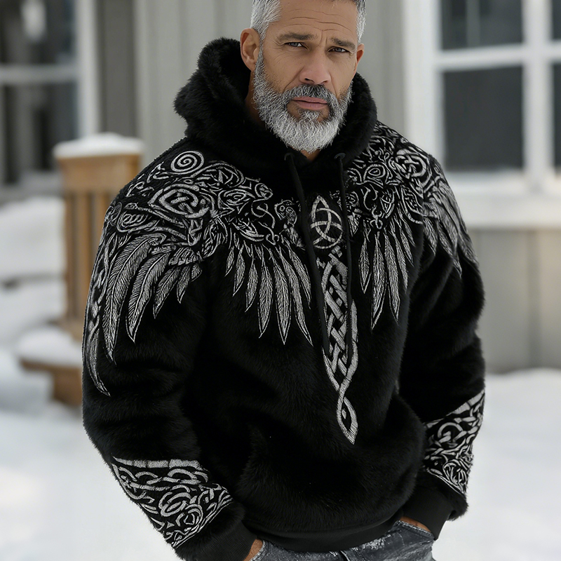 Men's Retro Viking Rune And Wing Pattern Plush Warm Hooded Sweatshirt