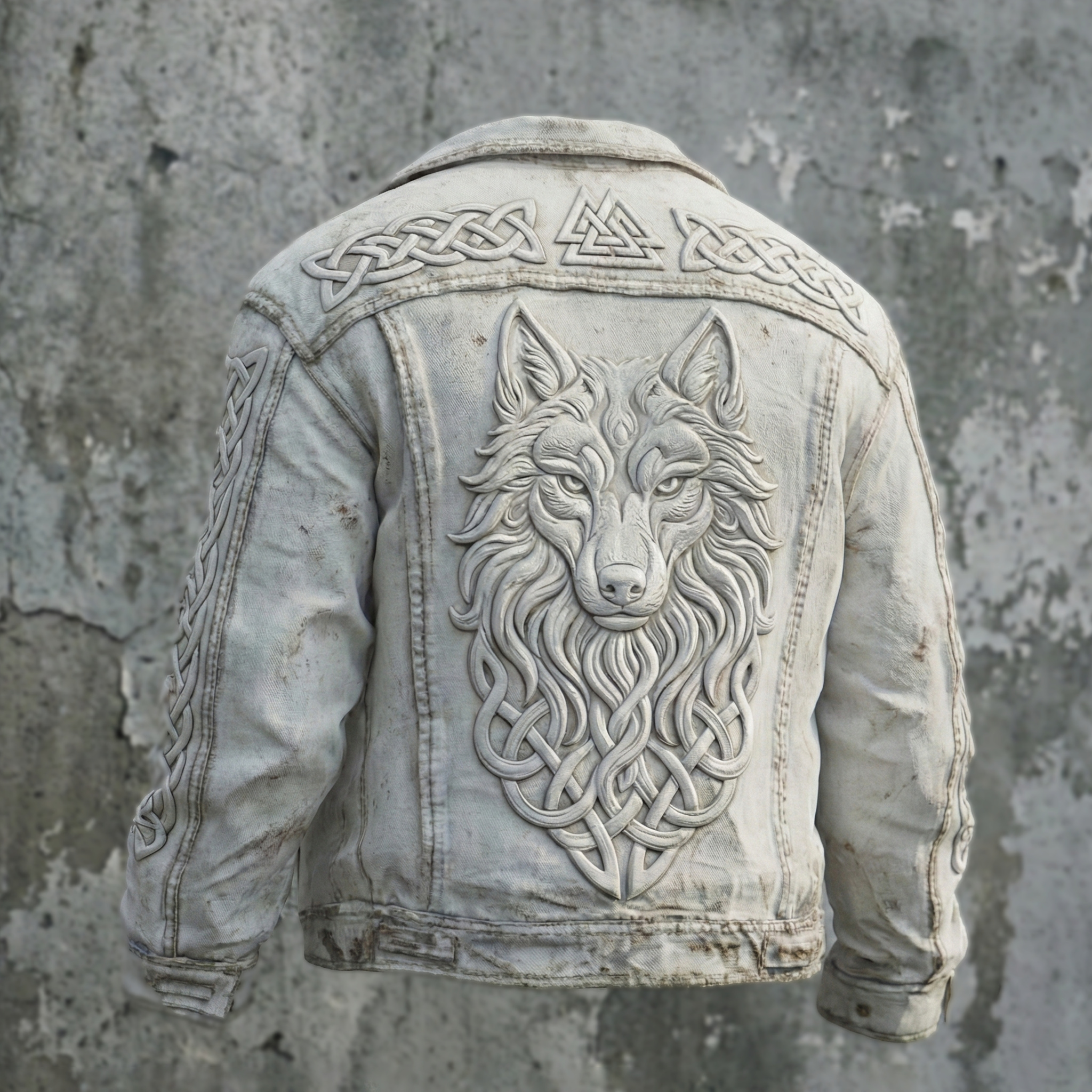 Men's Retro Viking Wolf Celtic Knot Art Washed Denim Jacket