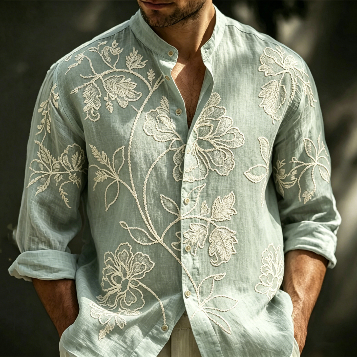 Men's Spring Floral Embroidered Art Print Flowy Linen Blend Casual Shirt