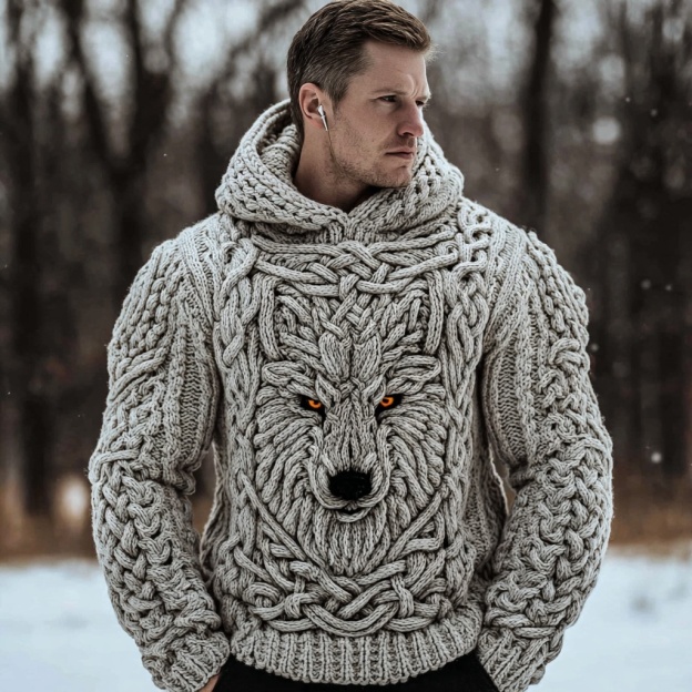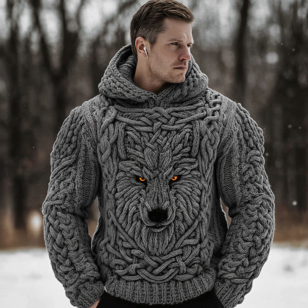 Men's Viking Celtic Wolf Knit Chunky Hooded Sweater