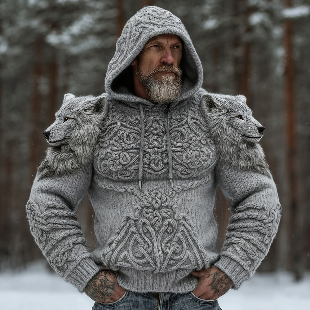 Men's Viking Style Wolf Totem Embroidered Celtic Knot Knitted Thick Hooded Sweater