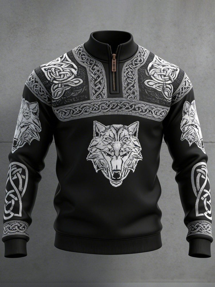 Men's Viking Wolf Celtic Knot Art Zipper Stand Collar Sweatshirt