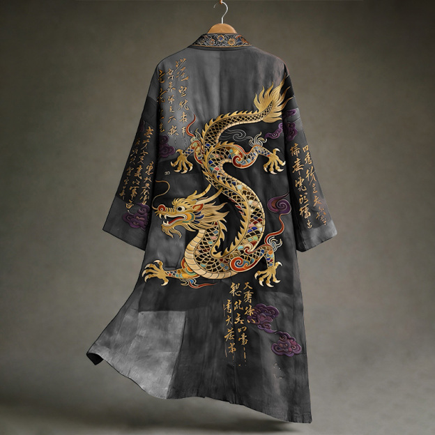 Men's Vintage Japanese Calligraphy Dragon Art Pattern Linen Blend Kimono