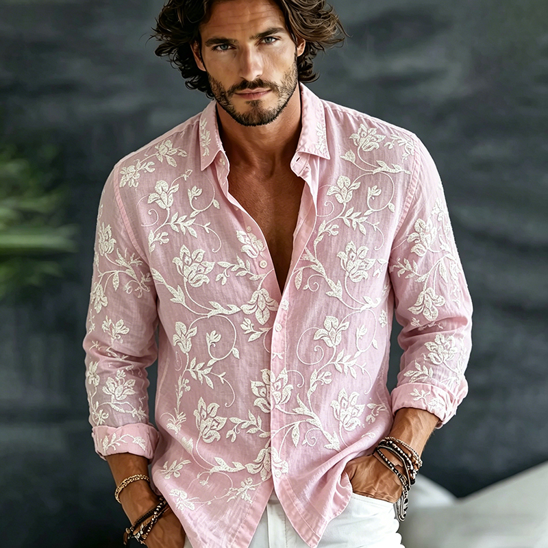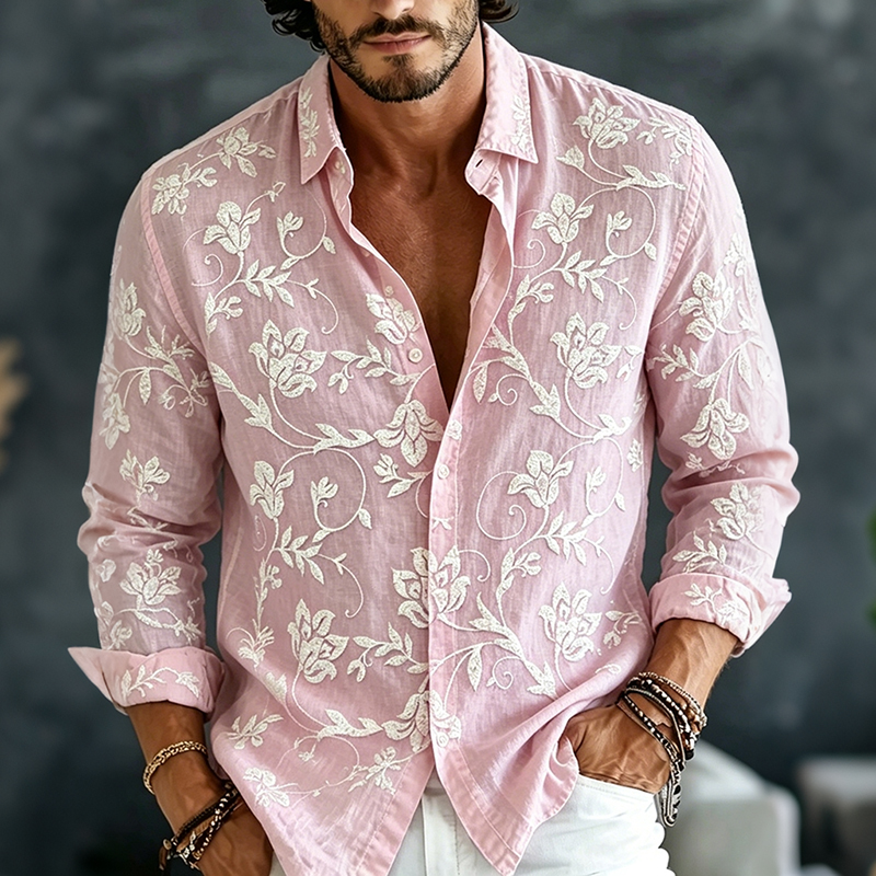 Men's Vintage Spring Floral Embroidered Art Print Flowy Linen Blend Casual Shirt