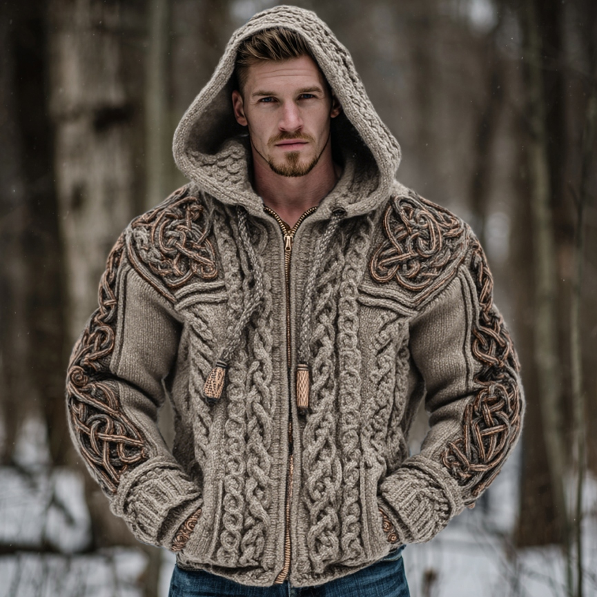 Men's Vintage Viking Celtic Knot Art Chunky Knit Hooded Zip-up Sweater