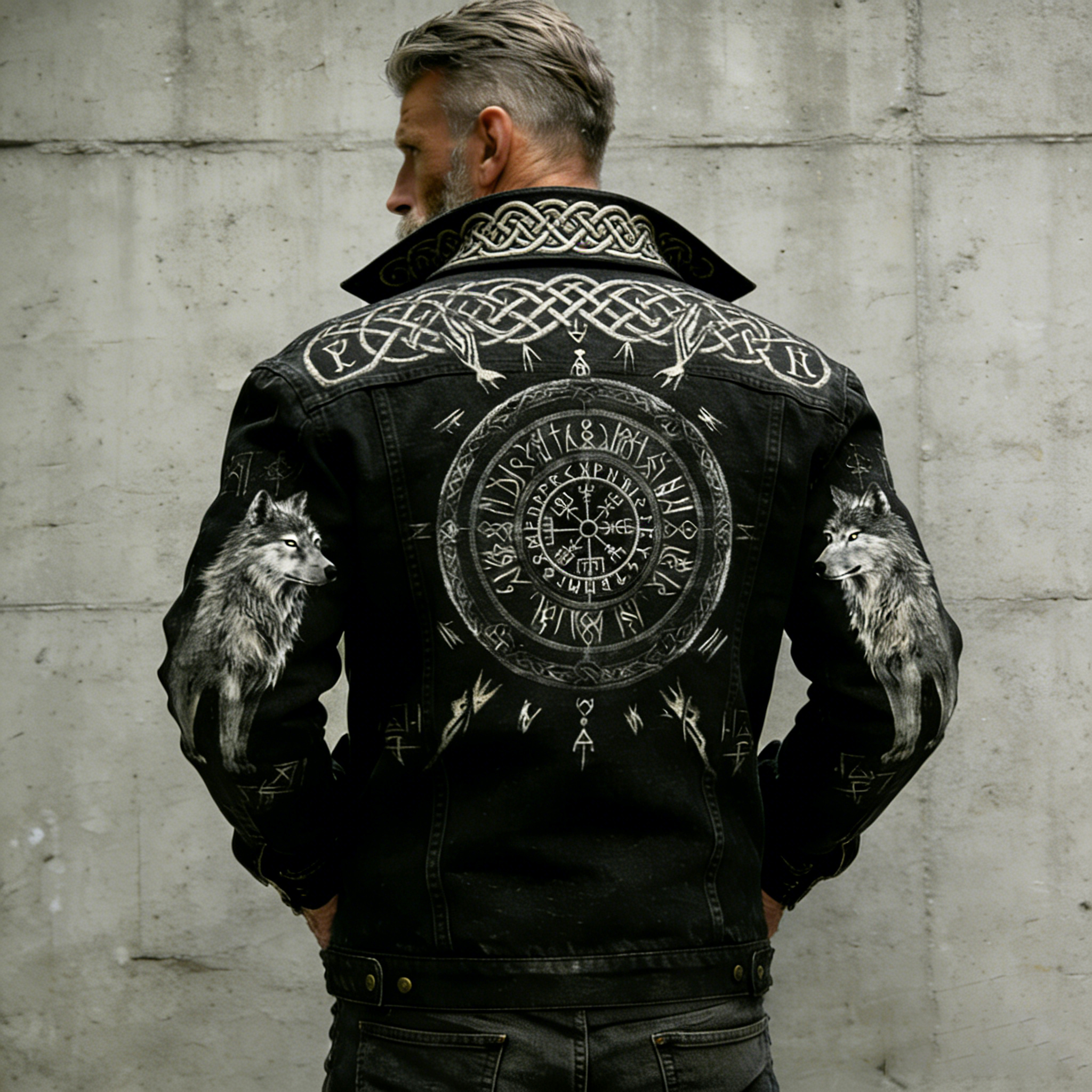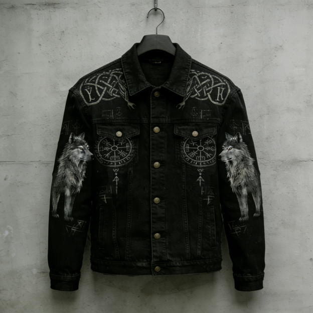 Men's Vintage Viking Vegvisir Wolf Celtic Art Washed Denim Jacket