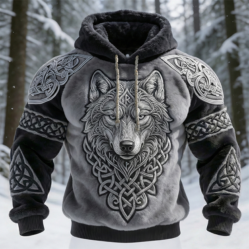 Men's Vintage Viking Wolf Celtic Knot Art Pattern Plush Hoodie