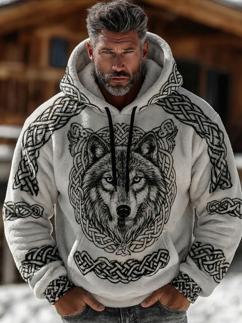 Men's Vintage Viking Wolf Celtic Knot Print Flannel Hoodie