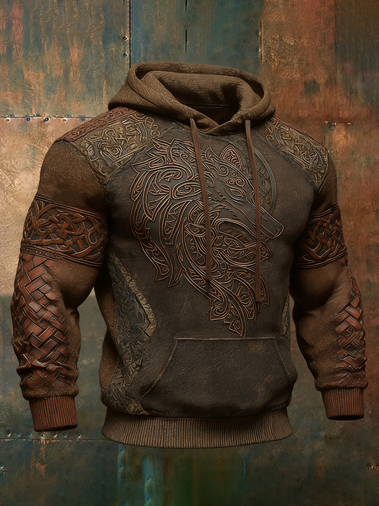 Men's Vintage Viking Wolf Celtic Patchwork Casual Hoodie