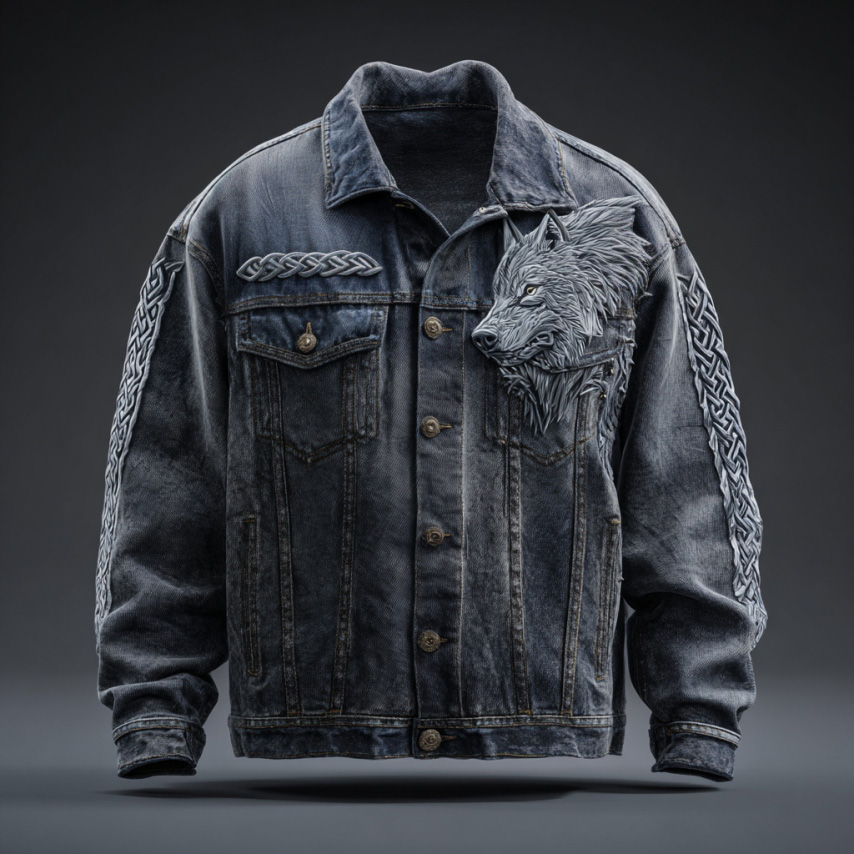Men's Vintage Viking Wolf Pattern Washed Denim Jacket